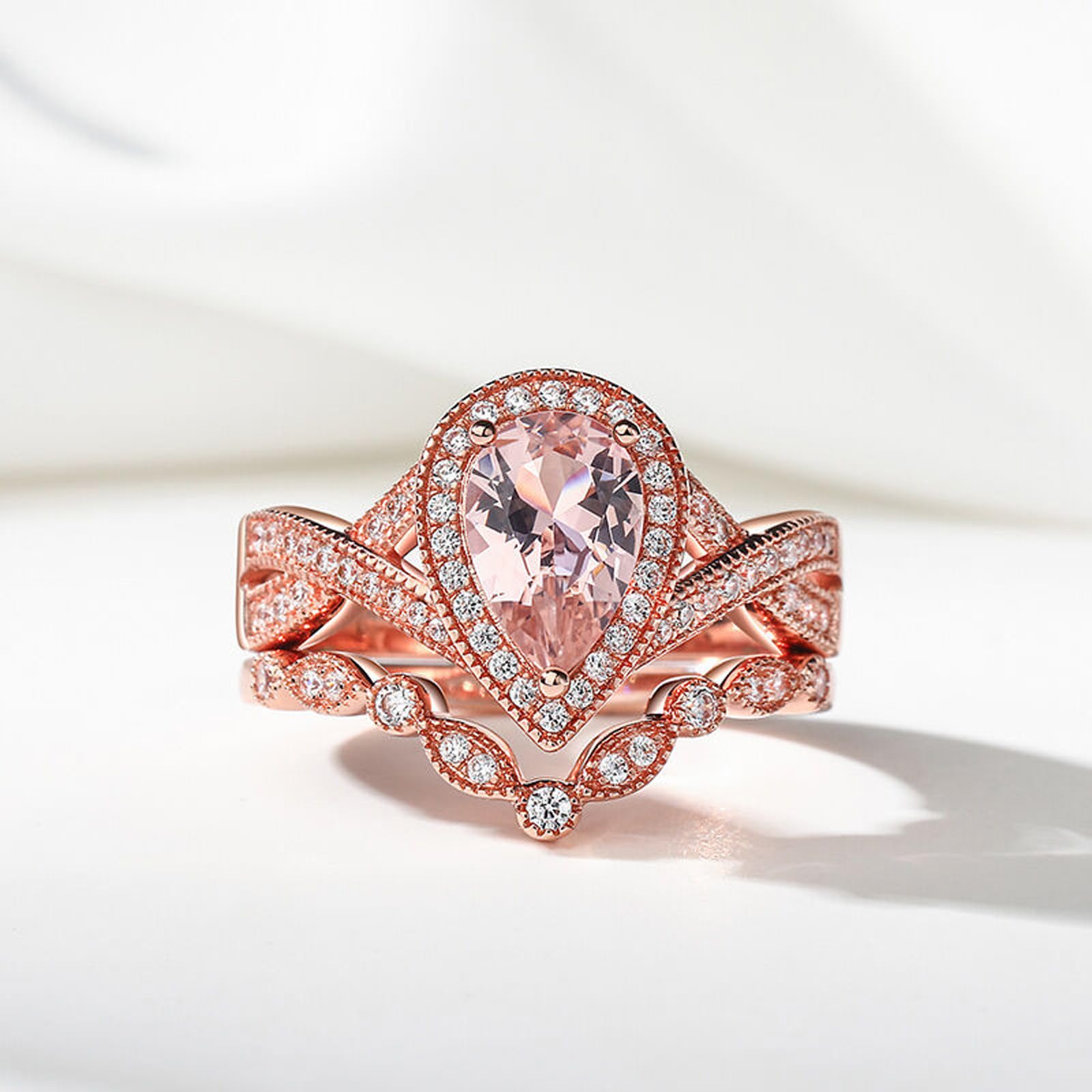 Jeulia 1.2ct Gemstone Engagement Ring Set for Women, Halo 2PCS Pear Cut Sterling Silver Rose Gold Wedding Band Ring Morganite Vintage Promise Bridal Jewelry with Gift Box