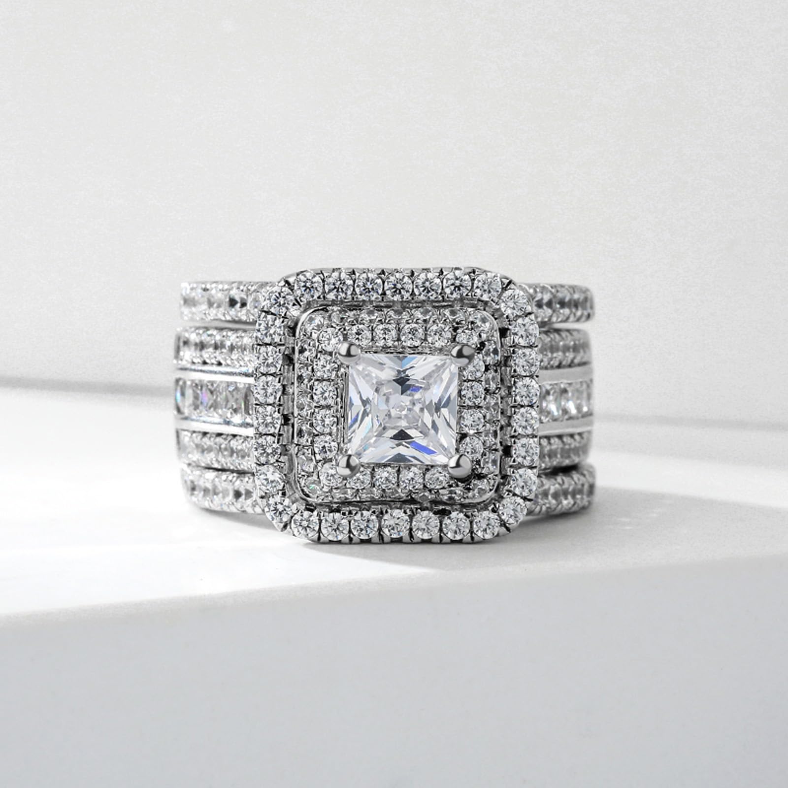 - ☀Design features: Your love shines brightly with this exceptional wedding set. Crafted in sterling silver, this spectacular design showcases a princess-cut center stone wrapped in triple halo cushion-shaped frames. Captivating with stones and a brilliant buffed luster, this scintillating wedding set is the look she's waited for all her life.