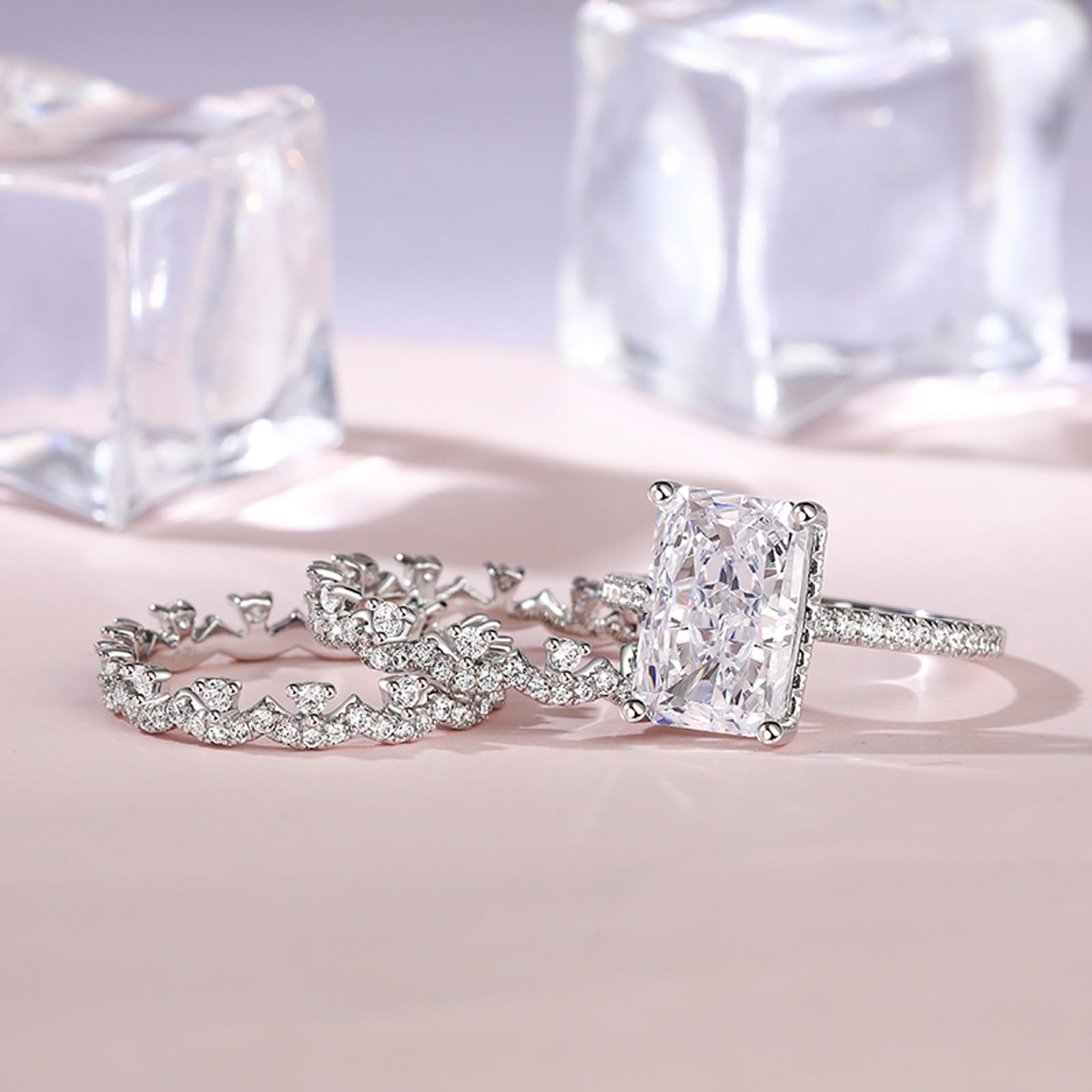 - ❀[Inspiration-3pcs Radiant cut Engagement Ring]Show off the light in your life with this stunning three-piece ring set. Crafted in sterling silver, this ring set features a emerald cut diamond center stone surrounded by a shimmering halo. Small gemstones are set into the setting to add sparkle. The ring comes with two matching bands so it can be cleverly combined. This ring makes a great holiday gift for yourself or a loved one!