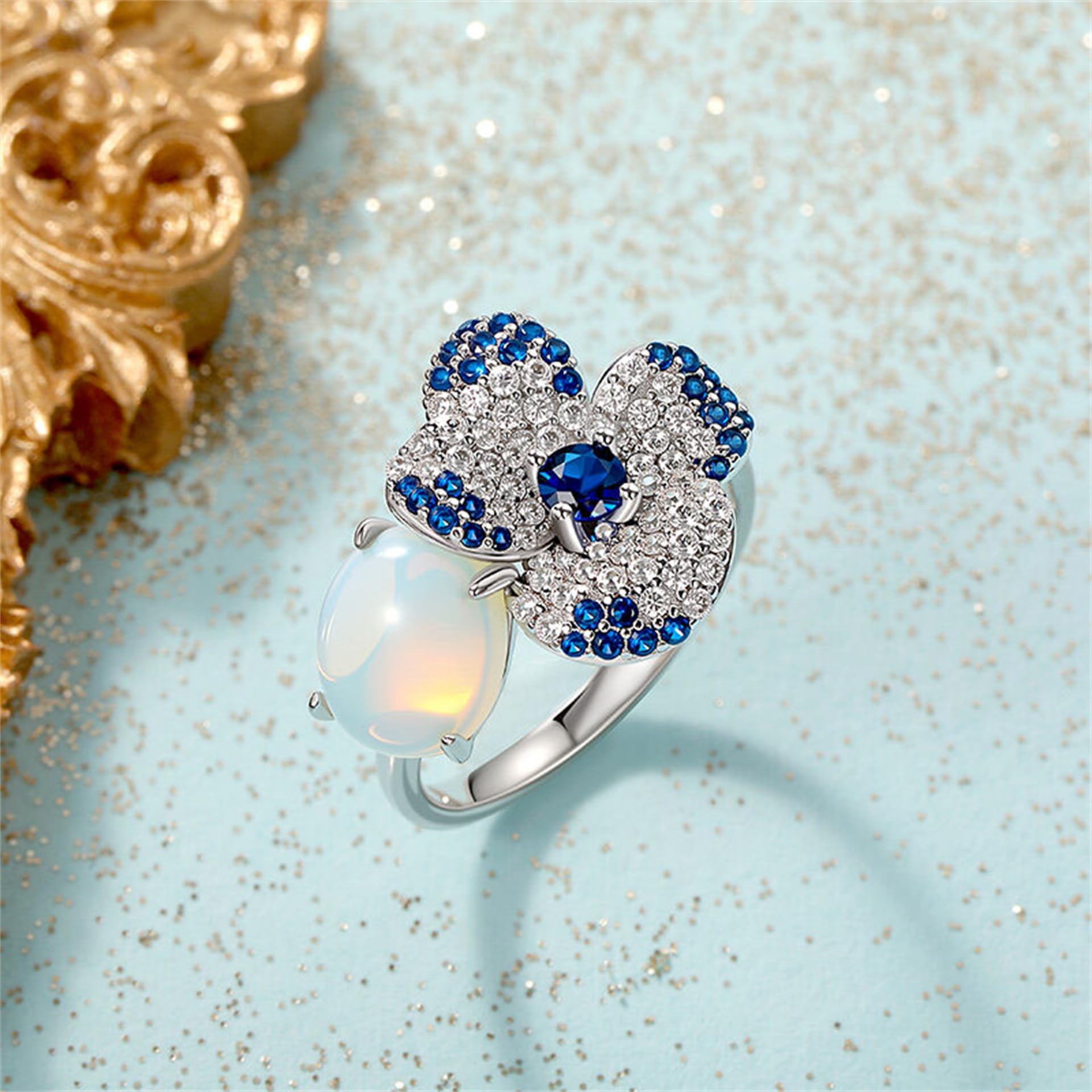 Jeulia Engagement Ring for Women, Sterling Silver Open Flower Stackable Band with Sapphire, Blue Diamond & Moonstone, Cubic Zirconia Promise Wedding Valentine's Gift with Box