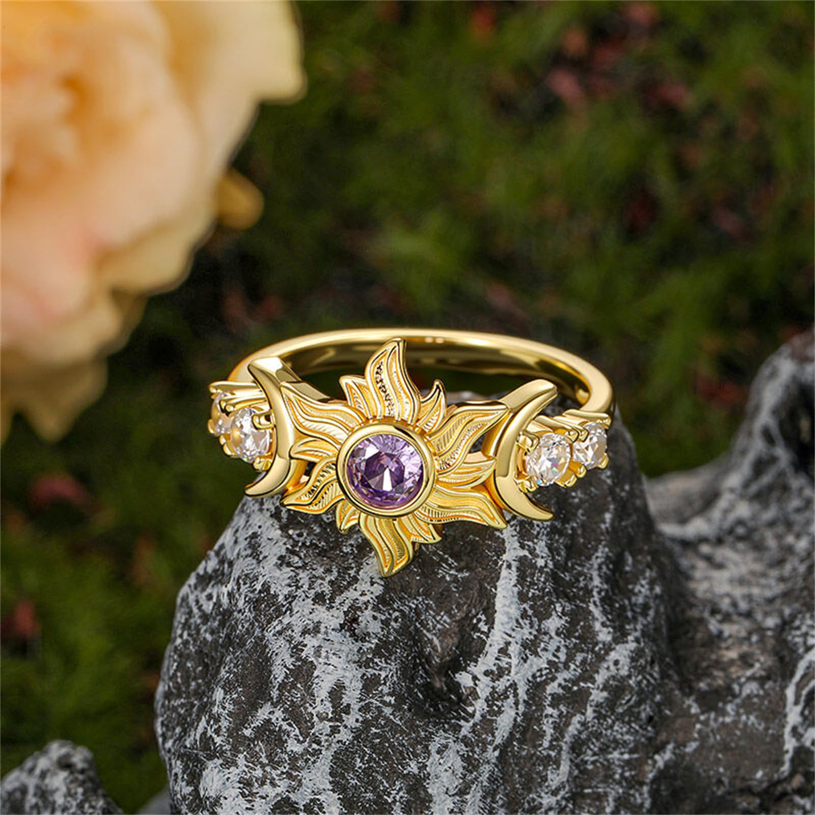 - Exquisite Sunflower Design with Royal Purple;Adorn your finger with this stunning sunflower ring, symbolizing adoration, loyalty, and longevity. The vibrant purple cubic zirconia center stone is elegantly set in a delicate, twist-shank base, capturing the beauty of a sun-dropped flower in full bloom. It's a unique and artistic piece of jewelry that stands out.