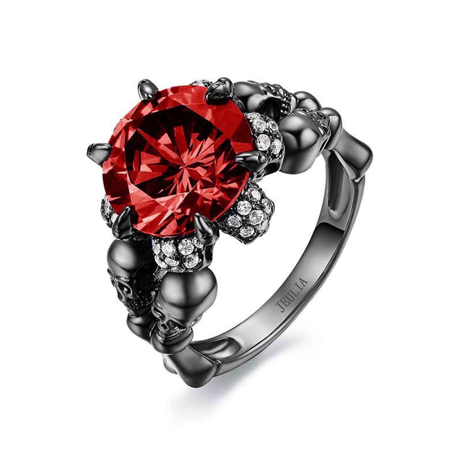 - 👹【Material Quality】The Jeulia Round Cut Silver Skull Black Gothic Ring with top quality AAA Jeulia stone always go well with 925 sterling silver rings. Have a resplendent sparkling and reflect rainbow gloss in the sunshine. Nickel-free, Lead-free, Cadmium-free and Anallergic, tarnish resistant and will not easily change color.