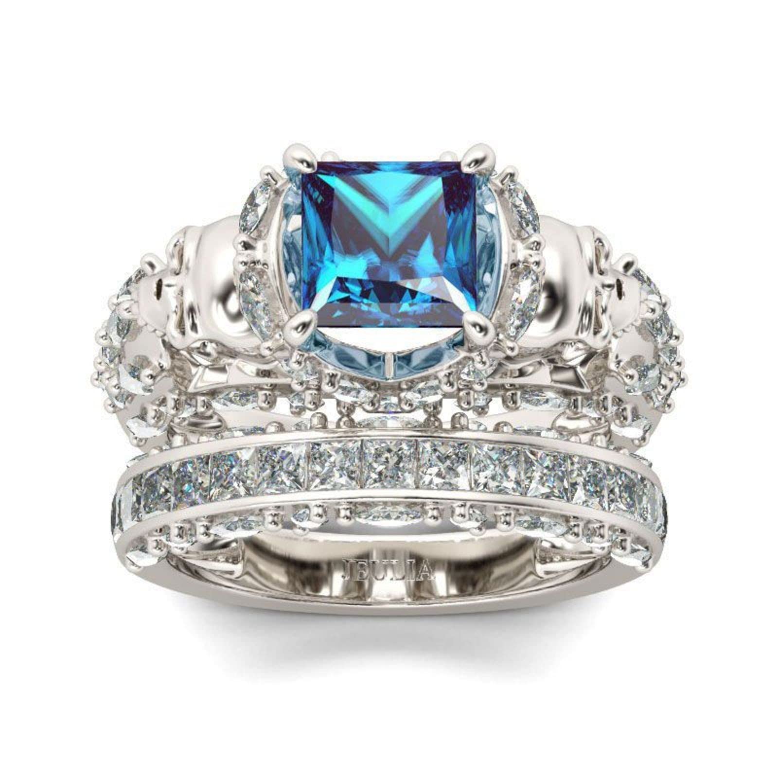 - 💍【Inspiration】:Skull represents freedom, individuality and a celebration of rebirth. This skull ring set will be an amazing gift for yourself or loved ones. Crafted in sterling silver, the ring features a sparkling princess cut center stone flank with skull heads on the shank of the ring. Additional marquise and round-cut stones line the shank while princess and round -cut stones are set into the matching band. This perfect skull ring makes you become the center of attention.
